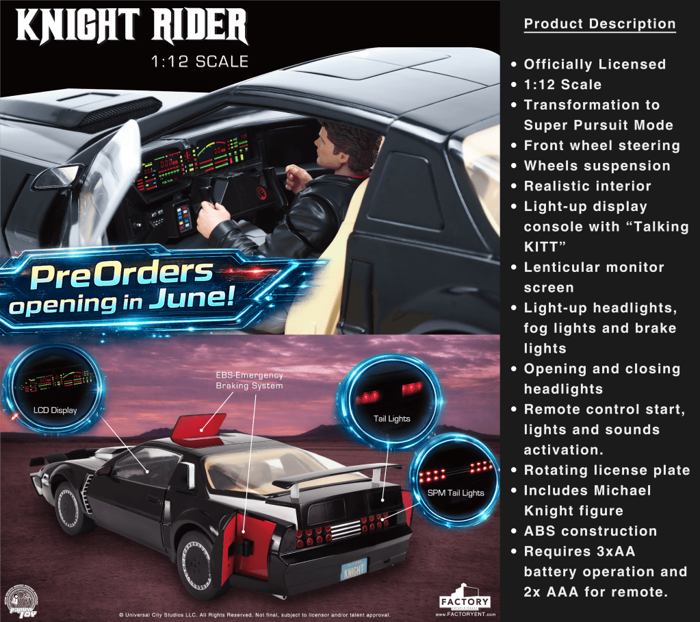 KITT will have remote control to activate the lights and sounds, and conversion mode! That’s right this vehicle will transform into the Super Pursuit Mode. It will have front wheel steering, suspension, a realistic interior with light up display. KITT will talk! Light up headlights, fog lights and brake lights. The headlights will open and close, and the license plate will rotate.